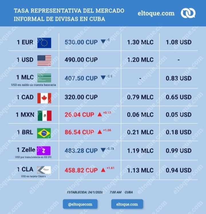By CubaNoticias in Economía — 24 ene. 2026 MERCADO INFORMAL DE DIVISAS AL CIERRE DE SEMANA EN CUBA Foto| El Toque (Facebook)